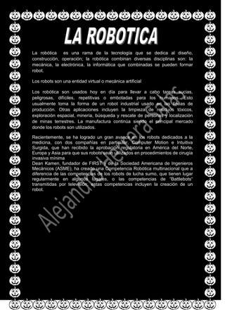La robótica combina disciplinas como la mecánica, electrónica e informática para diseñar, construir y operar robots. Los robots son entidades mecánicas o virtuales que se usan para realizar tareas peligrosas, sucias, repetitivas o difíciles para los humanos, como en líneas de producción industrial. Recientemente, los robots también se usan en cirugía mínimamente invasiva.