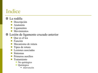 El documento describe la lesión del ligamento cruzado anterior de la rodilla, incluyendo su anatomía, función, tipos de lesiones, síntomas, tratamiento quirúrgico y no quirúrgico. El ligamento cruzado anterior conecta el fémur y la tibia y brinda estabilidad a la rodilla. Las lesiones generalmente ocurren durante movimientos bruscos y requieren cirugía reconstructiva u opciones no quirúrgicas como la rehabilitación prolongada.