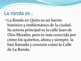 La Ronda es un barrio histórico de Quito ubicado a lo largo de la calle Juan de Dios Morales. Originalmente era un camino inca que servía para acceder al agua, y con el tiempo se convirtió en un refugio para artistas y bohemios. La Ronda alberga edificios antiguos y es una zona turística popular para experimentar la cultura y tradiciones quitenas.