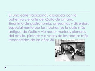 La Ronda es una calle tradicional en Quito, Ecuador asociada con la bohemia y el arte en el pasado. Es la calle más antigua de Quito y fue el hogar de muchos músicos, pintores y poetas reconocidos en los años 1930. Originalmente se llamaba "El Chaquiñán" por los indígenas. Aunque su nombre actual fue dado por los españoles, la calle data de 1480 cuando los Incas llegaron por primera vez a Quito. Hoy en día, La Ronda ofrece mucha gastronomía, artesanías y entretenimiento cultural