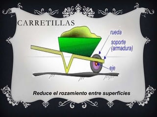 Las ruedas dentadas, rodillos, cojinetes y otros mecanismos que utilizan el principio de rodadura son útiles para transmitir movimiento entre ejes, reducir la fricción y facilitar el movimiento de cargas pesadas. Algunos ejemplos son carretillas, laminación de materiales, trenes y engranajes que convierten movimientos rotatorios.