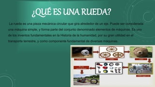 La rueda es una pieza circular que gira alrededor de un eje y reduce el esfuerzo necesario para mover objetos, facilitando el transporte. Sirve para transmitir movimiento entre ejes y transformar entre movimientos giratorios y de otro tipo. Existen diferentes tipos como ruedas de polea, transporte, dentadas e hidráulicas. Se utilizan comúnmente en vehículos, máquinas y electrodomésticos.