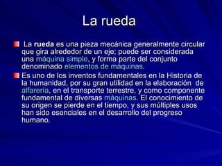 La rueda es una pieza mecánica circular que gira alrededor de un eje y forma parte de máquinas simples. Se considera uno de los inventos más importantes en la historia humana debido a su utilidad en el transporte y en la fabricación de alfarería y máquinas. Se cree que la rueda fue inventada en Mesopotamia en el quinto milenio a.C. inicialmente para usarla en alfarería y luego en carros, difundiéndose por el Viejo Mundo. La rueda ha evolucionado de simple