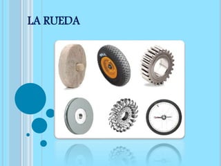 La rueda es una pieza mecánica circular que gira alrededor de un eje y es uno de los inventos más importantes de la historia humana. Se cree que la primera rueda fue inventada por la civilización sumeria hacia el año 3580 a.C. y se usó inicialmente en alfarería. Desde entonces, la rueda ha revolucionado el transporte terrestre y se ha convertido en un componente fundamental de máquinas. Hoy en día existen diversos tipos de ruedas que cumplen funciones variadas.