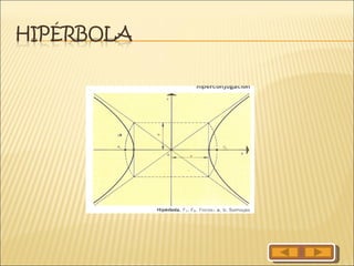 Este documento describe las diferentes tipos de cónicas (elipses, hipérbolas, parábolas y circunferencias), que son curvas planas obtenidas al cortar una superficie cónica por un plano. Explica cómo el ángulo que forma el plano de corte con la superficie cónica y su eje determina qué tipo de curva se obtiene, y proporciona definiciones geométricas y ecuaciones algebraicas de cada una. También menciona algunas aplicaciones prácticas de las cónicas.
