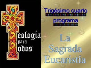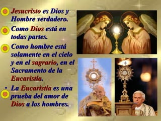 El documento describe la presencia real de Jesucristo en la Eucaristía, cómo se convierte el pan y el vino en su Cuerpo y Sangre durante la misa a través de las palabras de la consagración, y los beneficios de recibir la comunión, incluyendo perdón de pecados y vida eterna. Explica también la obligación anual de comulgar y la preparación necesaria como estar en gracia de Dios y ayunar.