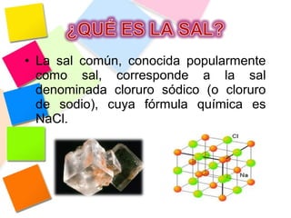La sal común, también conocida como cloruro de sodio, se utiliza comúnmente como condimento de los alimentos y para conservar carnes y pescados. Proporciona sabor salado a los alimentos, estimula el apetito e incrementa la absorción de agua en las masas fermentadas. La sal fortalece el gluten, aumenta la fuerza y tenacidad de la masa, y mejora la conservación del pan terminado.