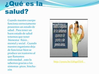El documento define la salud como un estado de bienestar físico, mental y social que se logra cuando el cuerpo funciona correctamente, mientras que la enfermedad surge cuando hay algún trastorno en el funcionamiento del organismo. Explica también que es importante adoptar hábitos saludables como parte de la prevención para mantener un buen estado de salud. Finalmente, clasifica los diferentes tipos de enfermedades y describe brevemente algunas formas comunes de prevención y tratamiento de enfermedades.