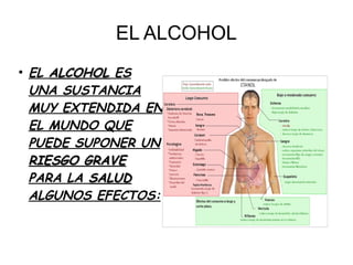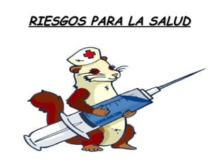 El documento habla sobre varios riesgos para la salud como el alcohol, el tabaco, las drogas y los accidentes de tráfico. El alcohol y el tabaco pueden causar graves problemas de salud si se abusan, mientras que las drogas modifican el funcionamiento cerebral y las relaciones personales. Los accidentes de tráfico son una causa común de lesiones y muertes, por lo que se deben respetar las normas de tránsito para prevenirlos.