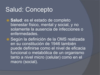 El documento define la salud como un estado de completo bienestar físico, mental y social según la OMS, y no solo la ausencia de enfermedades. Explica que la salud depende de factores biológicos, ambientales, del estilo de vida de cada persona y de la organización del sistema de salud. Finalmente, discute diferentes definiciones de salud mental.