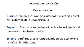 Este documento describe los cambios internos y externos que evidencian que una persona ha nacido de nuevo espiritualmente. Algunos de estos cambios incluyen tener un corazón lleno de felicidad y gratitud, un alma que anhela compañerismo con Dios, deseo de estar con la familia de Dios, una visión reenfocada, y el rechazo de todo tipo de pecado. El objetivo es ayudar a los estudiantes a identificar estas señales de transformación en sus propias vidas.