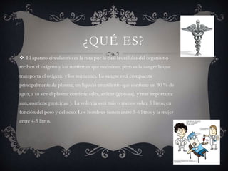 La sangre transporta oxígeno y nutrientes a las células a través del sistema circulatorio. Está compuesta principalmente de plasma y células como eritrocitos, leucocitos y plaquetas. La hemoglobina dentro de los eritrocitos es la proteína responsable del transporte de oxígeno en la sangre, mientras que la mioglobina almacena oxígeno en los músculos. El proceso de coagulación involucra plaquetas, proteínas y una cascada de reacciones que forman un coágulo para detener sangrados.