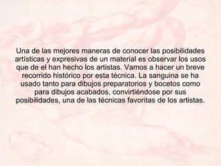 Este documento presenta una breve historia del uso de la sanguina como técnica artística. A lo largo de la historia, artistas como Leonardo da Vinci, Miguel Ángel, Watteau y Degas han utilizado la sanguina tanto para bocetos como para obras acabadas debido a sus posibilidades expresivas. El documento también incluye ejemplos concretos de obras realizadas con esta técnica de diferentes épocas.