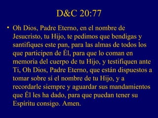 La oración bendice y santifica el pan de la Santa Cena para las almas de los que participan en ella, para que al comerlo recuerden el cuerpo de Cristo y testifiquen su disposición a tomar su nombre, recordarle siempre y guardar sus mandamientos, a fin de tener su Espíritu con ellos.