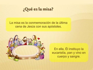 La misa es la conmemoración de la última cena de Jesús y la institución de la eucaristía. Se divide en dos partes: la liturgia de la palabra, que incluye lecturas bíblicas, salmos y homilía; y la liturgia eucarística, en la que el pan y el vino se convierten en el cuerpo y la sangre de Cristo mediante la consagración para que los fieles lo reciban en la comunión.