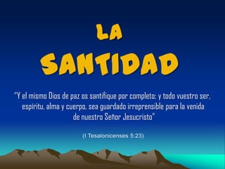 Este documento presenta un curso sobre la santidad para cristianos. Introduce el tema explicando que la santidad es un mandato bíblico y un tema de suma importancia. Luego explora lo que significa la santidad, las razones por las que los cristianos deben practicarla y principios para lograrla, como evitar el pecado y resistir al diablo. El objetivo es enseñar a los creyentes la necesidad y maneras de vivir santamente.