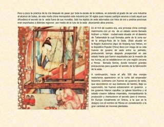 El documento describe la historia de la cría del gusano de seda y la industria de la seda a través de los siglos. Originalmente domesticado en China hace miles de años, el gusano de seda fue introducido en otras regiones como el Imperio Bizantino, el mundo árabe y Europa a través de la Ruta de la Seda y el trabajo de monjes. Hoy en día, la cría del gusano de seda y la producción de seda es una industria global que emplea a miles de personas en todo el mundo. El documento también describe las diferentes razas