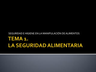El documento resume los principales conceptos relacionados con la seguridad alimentaria, incluyendo la definición de seguridad alimentaria según la FAO, los eslabones de la cadena alimentaria y sus responsabilidades, y la importancia de la información en la etiqueta para el consumidor.