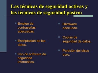 El documento describe varias técnicas de seguridad activas y pasivas para proteger la seguridad en Internet, incluyendo el uso de contraseñas seguras, encriptación de datos, software de seguridad como antivirus y cortafuegos, hardware adecuado, copias de seguridad y partición del disco duro. Recomienda que las contraseñas contengan mayúsculas, minúsculas, números y se cambien periódicamente, y que la encriptación cifra los datos para proteger la privacidad y autenticidad. También recomienda software