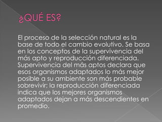 La selección natural es el proceso evolutivo por el cual los organismos mejor adaptados a su entorno tienen más probabilidades de sobrevivir y reproducirse, transmitiendo sus genes a las generaciones futuras. Esto conduce a cambios graduales en las poblaciones a lo largo de muchas generaciones, lo que puede dar lugar a la formación de nuevas especies. La selección natural depende de la variación genética provocada por mutaciones, y favorece aquellas mutaciones beneficiosas que aumentan la supervivencia y la reproducción.