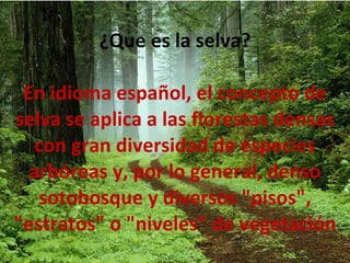 La selva es un bosque denso y húmedo ubicado en las zonas tropicales con gran diversidad de especies de plantas y animales. Las selvas tienen un clima cálido y húmedo con altas precipitaciones y temperaturas constantes. Existen varios tipos de selvas como las selvas tropicales, selvas de montaña y selvas de galería a lo largo de los ríos. Las selvas son ecosistemas cruciales que proveen oxígeno y albergan una gran biodiversidad.