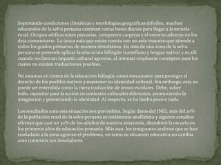 La selva peruana se extiende por más del 60% del territorio peruano, lo que hace que Perú sea principalmente amazónico. La selva peruana alberga una gran biodiversidad de plantas y animales, y está habitada por varios grupos indígenas. La educación en la selva enfrenta desafíos debido a factores como la infraestructura y la selección de maestros.