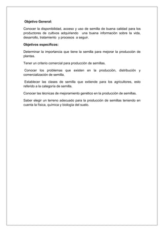 La semilla es importante para la reproducción y propagación de las plantas. Consta de un embrión, reservas nutritivas y una cubierta protectora. Para germinar, la semilla absorbe agua y oxígeno, las reservas se utilizan y la planta adquiere autonomía. Existen dos tipos de germinación y varios factores influyen en el proceso. Las semillas presentan latencia que puede eliminarse con tratamientos como la estratificación o escarificación. Es necesario seguir procesos adecuados de recolección, limpieza