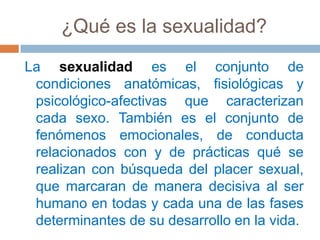 La sexualidad se define como el conjunto de condiciones anatómicas, fisiológicas y psicológicas que caracterizan a cada sexo y los fenómenos emocionales y conductas relacionadas con el placer sexual. Se compone de cuatro características: erotismo, vinculación afectiva, reproductividad y sexo físico. El documento también discute los derechos sexuales, la orientación e identidad sexual, y aspectos de la reproducción, legislación y control de la natalidad.