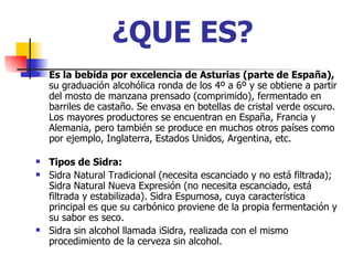 La sidra es una bebida alcohólica tradicional de Asturias (España) hecha del jugo fermentado de manzanas. Se produce principalmente en España, Francia y Alemania. Existen diferentes tipos de sidra como la natural tradicional, la nueva expresión y la espumosa. Su graduación alcohólica va de 4° a 6°. La sidra tiene beneficios para la salud como prevenir enfermedades del corazón y ayudar con la digestión.
