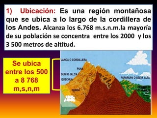 Este documento describe las características geográficas, climáticas y económicas de la región de la sierra en Perú. La sierra se ubica a lo largo de la cordillera de los Andes entre los 500 y 8,768 metros sobre el nivel del mar, tiene un clima que varía desde cálido a frío y presenta relieves como nevados, quebradas y mesetas. La agricultura, ganadería y minería son las principales actividades económicas de la región, donde se cultivan productos como el trigo, la oca