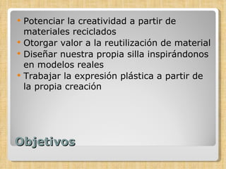 Este documento describe una actividad creativa para estudiantes de educación especial que involucra el diseño y creación de una silla utilizando materiales reciclados. Los objetivos son potenciar la creatividad, dar valor a la reutilización y diseñar una silla inspirada en modelos reales para trabajar la expresión plástica. Se proporcionan instrucciones sobre los materiales y se describe el modelo de silla Eames Chair que sirvió de inspiración, con enlaces a imágenes. Se incluyen bocetos del diseño modificado y un pro