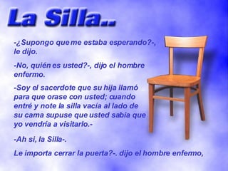 El sacerdote visita a un hombre enfermo a pedido de su hija. El hombre le cuenta que ha estado hablando con Jesús sentado en una silla vacía a su lado durante horas cada día por los últimos cuatro años. Dos días después, la hija informa que el hombre murió pacíficamente con la cabeza recostada en la silla vacía. El sacerdote cree que esto significa que Jesús vino a llevarse al hombre.