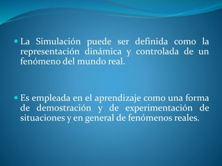 Este documento describe la simulación por computadora como la representación dinámica de fenómenos del mundo real. Explica que la simulación se usa para demostrar situaciones que no se pueden experimentar directamente y que involucra la creación de modelos. También discute los componentes clave de una simulación como la fidelidad y el manejo del tiempo.