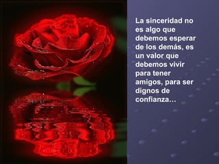 La sinceridad es un valor importante que debemos cultivar para tener amigos dignos de confianza. Ser sincero requiere decir siempre la verdad, incluso cuando es difícil, y asegurarse de que nuestras acciones concuerdan con nuestras palabras. También se necesita tacto para decir verdades incómodas de una manera que ayude a los demás sin ofenderlos. La sinceridad demanda valor y honestidad para decir la verdad en todo momento, a pesar de las posibles consecuencias, porque mentir es más vergonzoso.