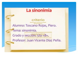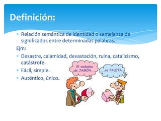 El documento define la sinonimia como la relación semántica de identidad o semejanza de significados entre determinadas palabras. Explica que hay diferentes clases de sinonimia, incluyendo sinonimia total, parcial y de diferencia de grado o magnitud de extensión. Finalmente, proporciona ejemplos de ejercicios para identificar sinónimos.