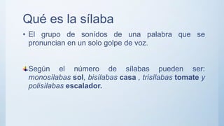 Este documento explica los conceptos básicos de la sílaba y la acentuación en español. Define la sílaba como un grupo de sonidos pronunciados en un golpe de voz y clasifica las palabras por su número de sílabas. También describe la sílaba tónica como la sílaba pronunciada con más fuerza y clasifica las palabras según la posición de la sílaba tónica en esdrújulas, llanas y agudas. Por último, resume brevemente las reglas de acentuación gráfica para cada tipo de palabra y propor
