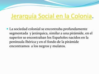 La sociedad colonial chilena estaba jerarquizada como una pirámide, con los españoles peninsulares en la cima. Los criollos, hijos de españoles nacidos en América, formaban la aristocracia junto con los peninsulares. Debajo estaban los mestizos, hijos de españoles e indígenas, y los indígenas, que sufrieron un fuerte declive demográfico. En la base se encontraban los esclavos negros y mulatos.