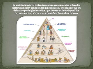 En la sociedad medieval, el rey ocupaba el lugar más alto aunque tenía poco poder político real y dependía de los vasallos para la defensa. Debajo del rey estaban los nobles, propietarios de tierras y entrenados para la guerra, y el clero regular y secular. En la parte baja estaban los campesinos libres que trabajaban la tierra para su subsistencia y los siervos que eran propiedad del señor feudal y estaban atados a la tierra.