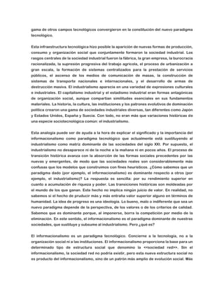 El documento resume el concepto de informacionalismo como un nuevo paradigma tecnológico definido por la revolución en la tecnología de la información. El informacionalismo se caracteriza por (1) la capacidad de procesamiento de información que se autoexpande, (2) la recombinación de información, y (3) la flexibilidad en la distribución del procesamiento de información. Este nuevo paradigma está impulsando el surgimiento de una sociedad red sustentada en estas tecnologías de la información.