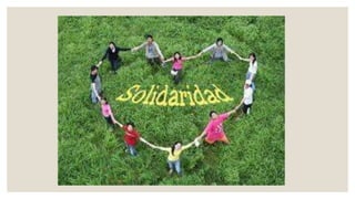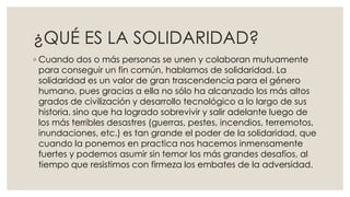 El documento habla sobre la solidaridad y cómo es un valor importante para la sociedad. Define la solidaridad como cuando personas se unen y colaboran para lograr un objetivo común. Explica que las personas solidarias se interesan por los demás y los ayudan cuando tienen dificultades. Las autoras creen que en su escuela faltan valores de solidaridad y proponen promover este valor entre sus amigos mediante pulseras con frases que alientan a la unión y ayuda mutua.