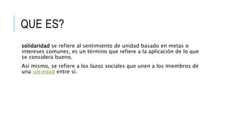 La solidaridad se refiere a los lazos sociales que unen a los miembros de una sociedad y al sentimiento de unidad basado en metas e intereses comunes. Implica compasión por el dolor de los demás, reconocimiento de su dignidad y una perspectiva que ve a toda la humanidad en una condición de pobreza compartida. Las personas pueden cultivar la solidaridad participando en iniciativas comunitarias de servicio como visitas a hospitales o campañas de recolección de alimentos, ropa y limpieza pública de acuerdo a