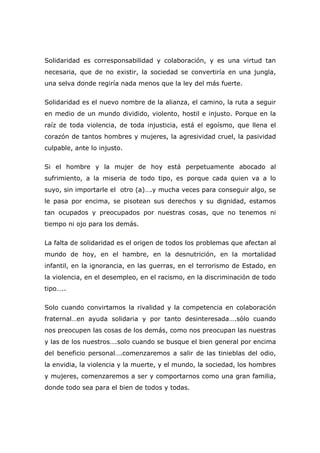 La solidaridad no es un simple sentimiento de lástima por los demás, sino un compromiso activo donde las vidas de las personas están estrechamente ligadas y deben apoyarse mutuamente. Ser solidario significa preocuparse por los problemas de los demás como si fueran propios y asumir la responsabilidad de ayudar a quienes lo necesitan. Sin solidaridad, la sociedad sería una jungla dominada por el más fuerte. La solidaridad representa la colaboración y alianza necesarias para construir un mundo más justo frente a la violencia y