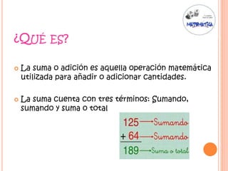 La suma es una operación matemática que permite adicionar cantidades y consta de tres términos: sumando, sumando y suma total. Esta operación tiene propiedades como la conmutativa, asociativa, distributiva y de cerradura, además de tener el número 0 como elemento neutro. Se debe realizar la suma comenzando de derecha a izquierda, siguiendo el orden de unidades, decenas y centenas.