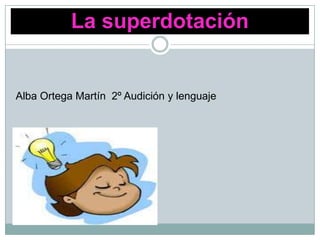 El documento presenta cuatro modelos explicativos de la superdotación: modelos de capacidades, modelos de rendimiento, modelos de componentes cognitivos y modelos socioculturales. La superdotación se determina por cuatro características: creatividad, alta capacidad, motivación y entorno. Se define como un fenómeno intelectual que requiere alta capacidad, creatividad y motivación, así como un entorno que estimule estas características. Las adaptaciones curriculares incluyen aceleración o flexibilización, enriquecimiento, programas