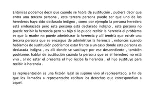 La sustitución permite designar a una persona para que herede en lugar del heredero original si este no puede o no quiere aceptar la herencia. La representación es una ficción legal que supone que el representado está vivo para que sus descendientes reciban los derechos que le correspondían. Hay dos formas de aceptar una herencia: de manera simple o a beneficio de inventario para protegerse de las deudas del difunto.