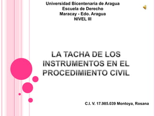 El documento presenta un resumen de los artículos 442 del Código de Procedimiento Civil Venezolano relacionados con la tacha de instrumentos. Brevemente describe 1) las facultades del juez para ordenar la exhibición del instrumento original si no fue presentado, 2) los casos en los que el juez civil puede apreciar los hechos aunque no haya decisión penal, y 3) las causales para tachar un instrumento privado de acuerdo al Código Civil.