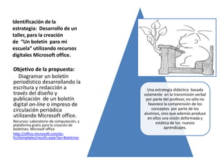 Este documento describe una estrategia didáctica para desarrollar un taller donde los estudiantes crearán un boletín escolar digital utilizando Microsoft Office. El objetivo es mejorar las habilidades de escritura y redacción de los estudiantes a través del diseño y publicación de un boletín periódico en línea o impreso. El taller se llevará a cabo en el laboratorio de computación de la escuela.