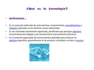 El documento define conceptos clave relacionados con la tecnología como la informática, los procesos, artefactos, sistemas, ciencia, técnica y diseño. Explica que la tecnología busca resolver problemas e insatisfacer necesidades transformando el entorno mediante el uso racional de recursos y conocimientos. También describe elementos usados por el hombre en la prehistoria como las herramientas de piedra y los métodos para obtener fuego, así como consecuencias de su aparición.