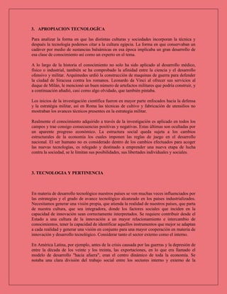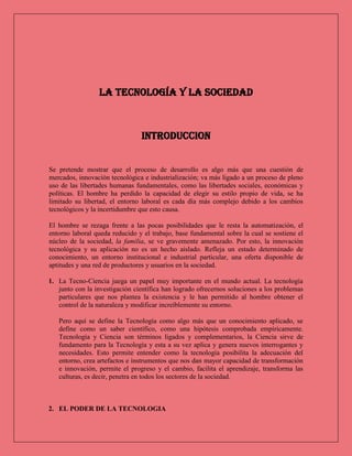 El documento discute el impacto de la tecnología en la sociedad y la economía. Explica que la tecnología ha permitido la globalización e interdependencia económica mundial, pero también ha creado desempleo en algunas regiones. Argumenta que los países deben desarrollar su propia visión tecnológica basada en su cultura e identificar factores sociales que fomenten la innovación. Concluye que la competitividad depende cada vez más de la capacidad de innovación de un país.