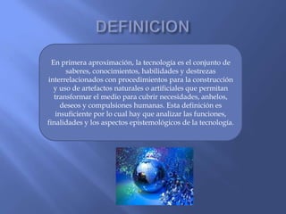 La tecnología se define como el conjunto de conocimientos técnicos ordenados científicamente que permiten diseñar bienes y servicios para satisfacer las necesidades humanas y facilitar la adaptación al medio ambiente. La tecnología usa métodos como la experimentación para construir artefactos mediante el uso de herramientas e instrumentos. Una tecnología se considera apropiada si mejora la calidad de vida sin dañar a las personas o el medio ambiente.